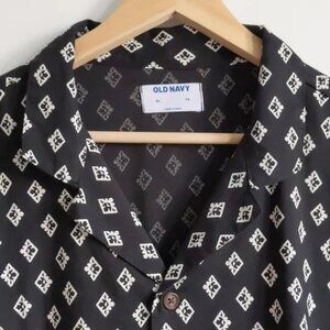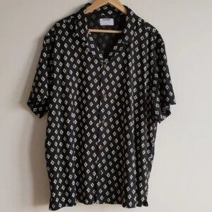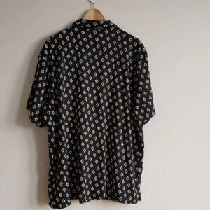 New without tags. He took off the tags before he tried it on 😂. Never worn. Super light and stylish shirt. Great for fall. Black with white pattern. 54% cotton.