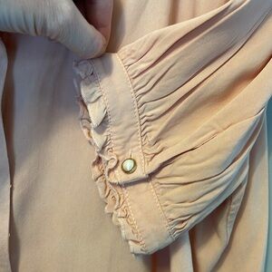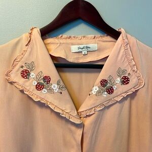 NWOT Simply Retro Strawberry Embroidered Blouse. Size medium. Only tried on, never worn. Beautiful strawberry and blossom embroidery on the collar, pearl and gold buttons and ruffle accents. Pink-peach in colour.