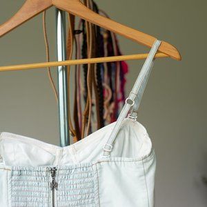This super soft light denim-look dress has never been worn. NWOT A gorgeous heavy metal zipper that features wings is definitely a special part of this dress.