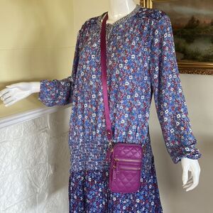 Brand new without tags cute Sondra Roberts vegan leather cross body bag. In beautiful purple vegan leather, quilted pattern, two exterior zippered pockets and one exterior slip pocket perfect for cell phone. Main compartment is zippered, interior is lined with 3 credit card slip pockets.