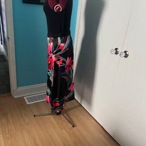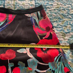 This beautiful skirt from Marks & Spencer is made from a stunning floral fabric that is quite substantial. Gorgeous red, and aqua flowers stand out on the black background. There are side pockets on each side of the skirt--total bonus!!! Closure is with an outside zipper to add visual impact. This skirt has never been worn. I sometimes buy things I consider beautiful and then don't really like them on me. My loss, your gain!!!
