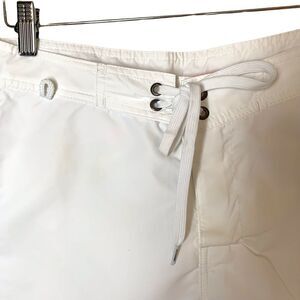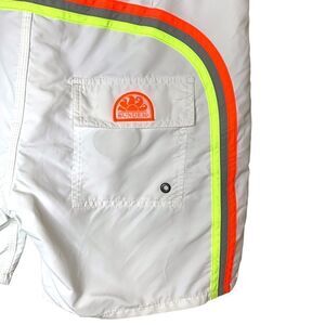 Men's white swim shorts by authentic surfer designers Sundek. Renowned for both functionality and style, these Sundek shorts are made of the finest material, charaterised by two layers of quick drying nylon and triple stitching that ensures long life and durability. With the signature rainbow stripe across the back, along with the Sundek logo on the rear pocket, these swim shorts have a modern designer look.
