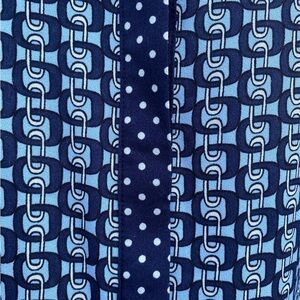 DESCRIPTION: A Simple Pintuck Button up blouse with a Chain link pattern in Blue and grey and contrasting Polkadot Cuffs, Back Shoulders, Neck line and Covered buttons.