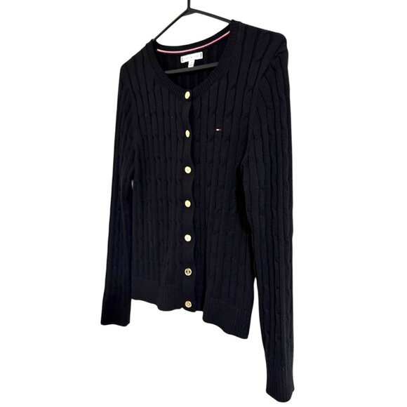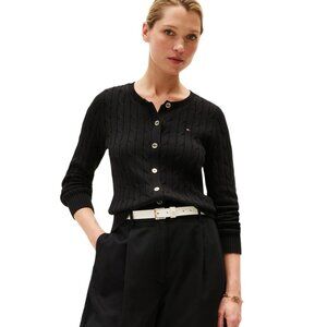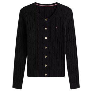 Tommy Hilfiger women's sweater. Made from a soft, lightweight cotton weave, this textured cable knit button-up cardigan is a versatile transitional-weather layer.