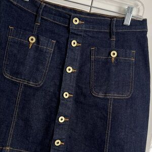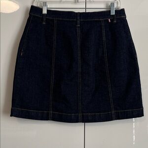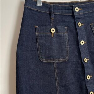 Dark denim skirt with brushed gold button-up front. Features dual front pockets with button closure. Belt loops. Sleek classic design very Parisian inspired. Ideal for casual or dressy wear. Stretch denim. New never worn.