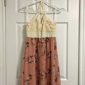 Beautiful flower design dress halterneck with built-in bra padding and cami slip lining. Crochet-like embroidery.