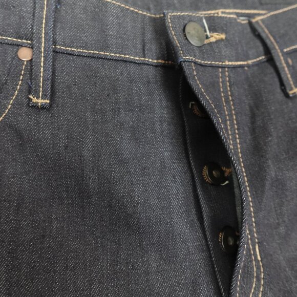 Premium quality, Made in USA, deep indigo blue colour, button fly. Excellent condition, nice and crisp, no stains, no rips or holes, appears to be unworn (New without tags). Tag size 33, waist measures a little over 34" and inseam is about 36.5" - see measurements in photos.