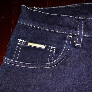 NWOT dark wash stretchy slightly flared Valentino jeans with contrast white stitching.