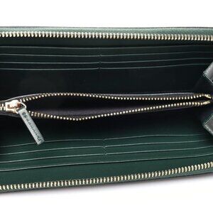 The wallet features a gold Medusa head, a wrap around the zipper that opens to a green interior with card slots, and a zipper compartment.