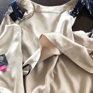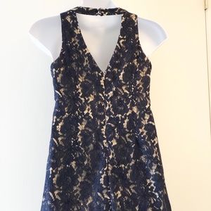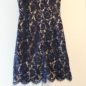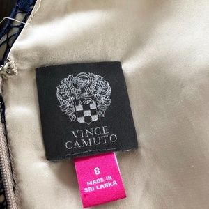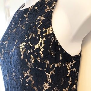 Lovely Vince Camuto Sleeveless Blue Floral Lace Dress with a beige lining. Lined throughout, with a double lining in bodice area. Crew neckline. Size: 8. Measures: 18" underarm to underarm, Length-36", Flares to 22". Measured laid flat. (Approximate measurements.) Has a 13" zipper in perfect working order, with a hook and eye at to top. Two lace buttons at back neckline, V-Neck Back.NWT