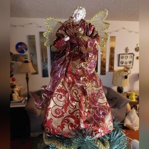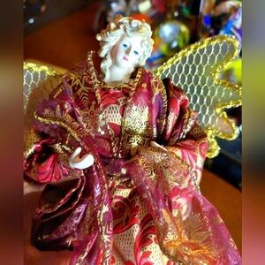 Vintage* Angel Tree Topper, Burgandy & Gold Gown. Approx 12" tall. 90s