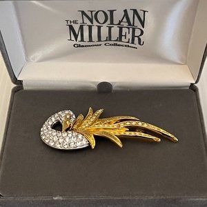 This Nolan Miller brooch pin from the Glamour Collection features a beautiful swan bird design in gold and silver plating, adorned with sparkling rhinestones. The piece is a true beauty, perfect for any occasion and ideal for those who love nature-inspired jewelry with a touch of glamour.