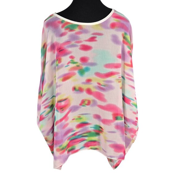 Make a statement with this stunning semi-sheer blouse! It features a vibrant, multi-colored watercolor abstract print in shades of pink, green, yellow, and blue. The relaxed batwing (dolman) sleeves and flowy silhouette provide a comfortable yet chic "Lagenlook" fit that is perfect for vacation, brunch, or an artistic office look.