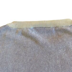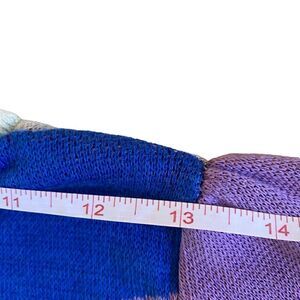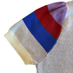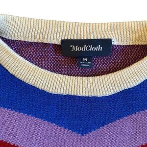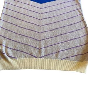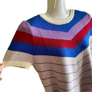 Lightweight summer sweater. Nice and colourful in that great chevron pattern. White with blue, purple and red highlights. Machine washable.