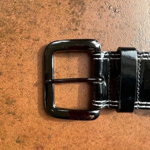 A lovely black patent belt with white stitching from Simons. The belt has a black metal buckle. Size small. The belt is 2” wide and the first hole it at 30” and last hole at 35”. Like new — never worn because it is too big for me.