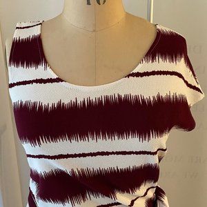 Beautiful never worn size 4 Willowmore burgundy and white striped asymmetrical dress. One shoulder is sleeveless, one shoulder is cap sleeve. Right side of dress is ruched. Attached tie belt.