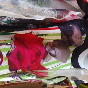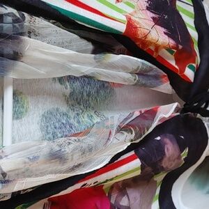 - top of vest is very vibrant in pink, reds, greens, black and white