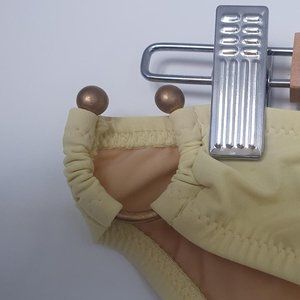 The colour is this light, buttery yellow, and has gold horse-shoe hooks on the front of the top and sides of the bottoms.