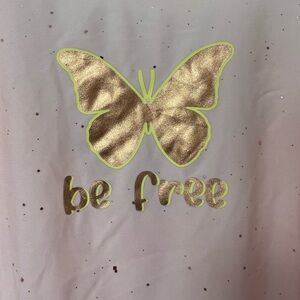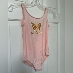 Adorable one-piece girls swimsuit by Young Hearts, featuring a soft pink base with scattered iridescent glitter accents and a metallic gold butterfly with the words “be free” on the front. Lined and includes hygienic liner.