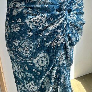 A bold take on summer ease. This sculptural sarong-inspired maxi skirt from Zara makes an unforgettable statement — from the deep teal floral print to the dramatic front knot and slit.