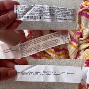 Crafted from a stretchy ribbed knit, it features multicolored horizontal stripes in pink, yellow/orange and cream tones.