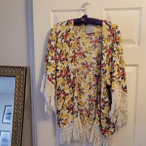 Cute Zara kimono with gold/rose/white/turquoise floral pattern and white 4-inch fringe on 3/4 length bell sleeves.