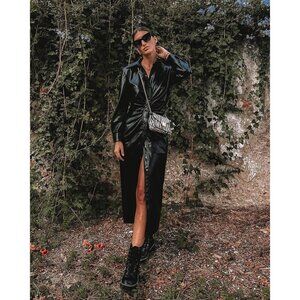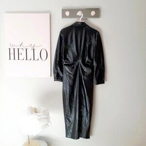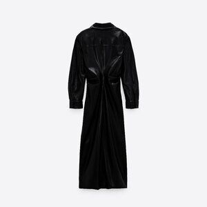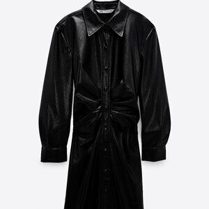 NWOT Zara black faux leather gathered waist button-up collared shirt dress, S
