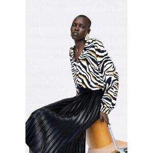 NWOT Zara black faux leather patent pleated A-line midi skirt, S