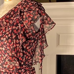 This dRA dress embodies all the elements of elegance and ease while maintaining a beautiful, bohemian profile. Side seam ruching adds dimension to its staggering hemline while its one shoulder strap of cascading ruffles and ties along with diagonal slit detail, make this maxi dress, in Poppy Blossom, an easy, chic example of timelessness.