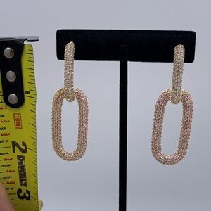 New, no tags. Real gold plate over copper base (to reinforce gold colour), round, clean, clear white CZ gems on the top loop, soft rose on the bottom loop. Fully pierced back to allow light to pass through for extraordinary sparkle. Articulated for eye catching movement. Masterfully crafted, these earrings look very expensive, but they're not! Elegant, striking, statement size. Add some refined flash to your simplest ensemble, and you ready for an upscale event. Or go full on glam as these earrings will compliment your most sumptuous velvets and satins. Finish your look with pieces from Our Closet (some suggestions shown all listed and priced separately), make a bundle to save a bundle. New postings daily so there's always something Fresh at Lemon Squeezy Shop🍋