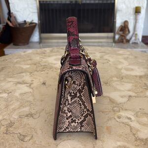 Stunning snakeskin embossed faux leather in two shades of purple, gold tone hardware, chain detail, detachable tassel, kiss-lock closure, one exterior zippered pocket. Interior is cloth lined and features a zippered pocket and an open slip pocket. There’s also a slip pocket under flap.