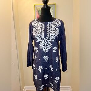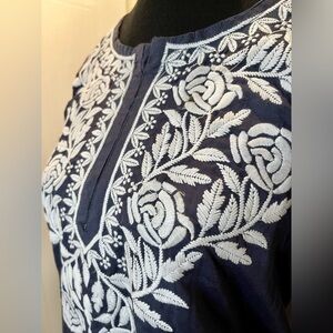 NWOT/Anavya Collection blue kurti rose pattern/white embroidery/notch collar💙🤍