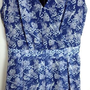 Sweet fit and flare sleeveless wrap bust dress with petrol blue and light gray geometric and floral print. Black lining. Rear nylon zipper closure. Ties at waist, front or back. Box pleated skirt. New without tags.
