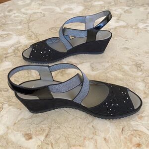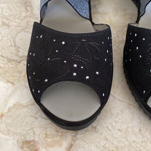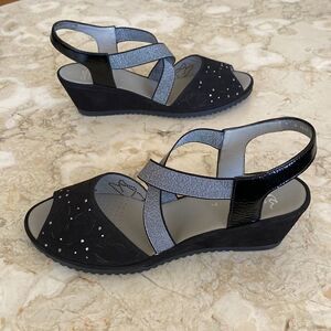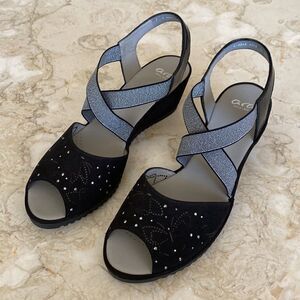 New without tags gorgeous Ara wedge leather sandals. Butterfly-shaped perforations and little metallic beads flutter across the studded toe strap of a comfortably cushioned sandal secured by stretchy, metallic striped elastic straps.