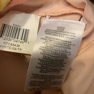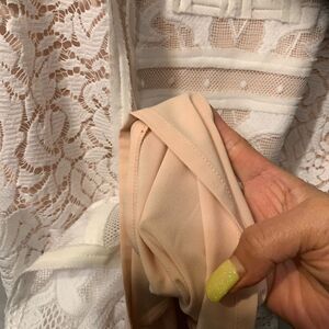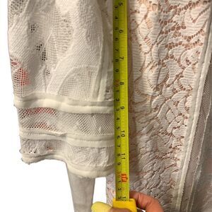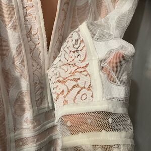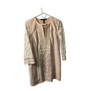 NWOT BCBGMaxAzria sheath Nikki lace dress. Has a v neck design with a sheer Lacey long three quarter long sleeve design. Does slip on from the bottom. The white lace print is over a light nude lining which absolutely make this dress so gorgeous on. Will be a perfect add to any closet great for all occasions. True colour is not as the first pic more like a an off white and fits a like a small.
