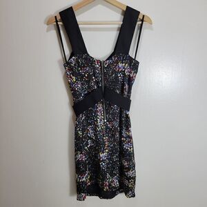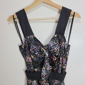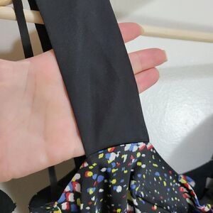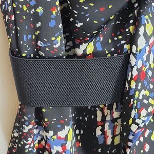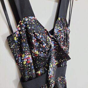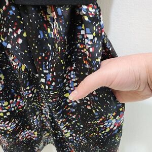 Lovely silky fabric with a primary multicolor artistic abstract print, thick elastic waist band, reap zipper closure, fully lined, wide shoulder straps, v neck shape with a gathered busy and surplus flounce frill. 2 pockets! New without tags. US size XS.