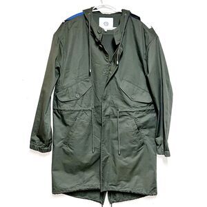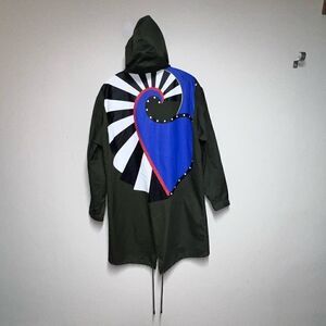 This is a brand new unique military inspired trench coat with super cool graphics on the back. Definitely a unisex item.