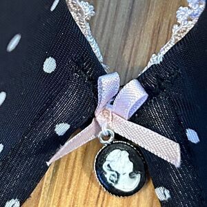 Black and white polka dot with black lace, white scalloped edges, pink ribbon charm detail