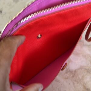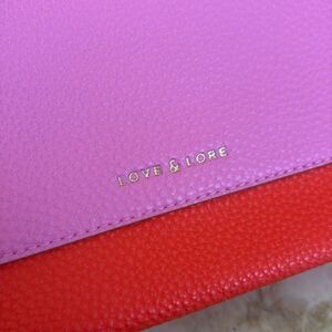 New without tags colourful Love & Lore vegan leather zippered pouch. One exterior pocket with snap, main zippered compartment, cloth lined interior with 6 credit card slots and an open slip pocket. Zipper pull is a wrist strap. Handy little piece for travel or use as a multi function case.