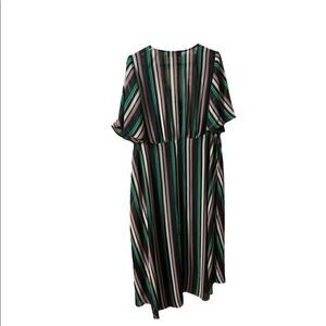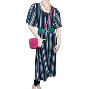 NWOT Love and Legend sheer long dress. Has a v neck and buttons down. The sleeves are bell shaped and the back of the dress is slightly longer than the front. Very light great for summer best worn with a tank top and shorts or leggings. Looks great belted unfortunately not included. Great summer dress has a green,black white and pink striped pattern.