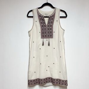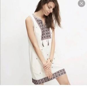 Madewell Embroidered Sun Coast Sleeveless Dress size M. A toss-on off white shift dress that ties at the neck with three-color tassels. The rich embroidery on this tunic was inspired by a vintage piece.