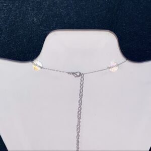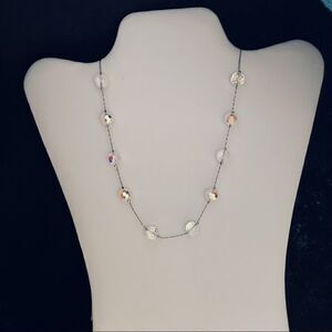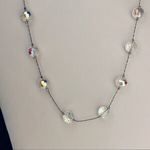 This is a very pretty necklace and earring set. In the grandiosity on of aurora borealis jewelry , the light reflects off it in a really pretty fashion, sometime creating a rainbow. Makes for a subtle but lovely addition to a work outfit, or a dress up outfit. Really emphasizes the neck and collarbones.