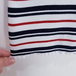 Cute sailor / nautical style ribbed tee with scallop frill trim at hem sleeves and collar, red and navy stripes. New condition without tags. US size Small.
