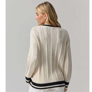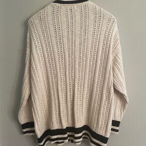 Open knit cream cricket style cardigan sweater with a black striped detail on the cuff and hems