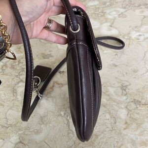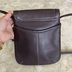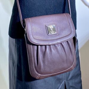 New without tags, gorgeous brown leather cross body bag by Tignanello. Rich pebbled brown leather, silver tone hardware, still factory attached branded key fob, magnetic flap closure, one exterior pocket, monogram cloth interior with one zippered compartment and one slip pocket.