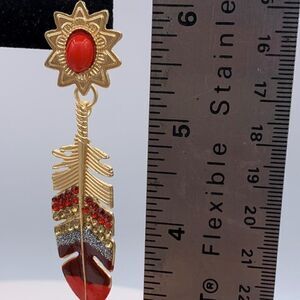 New item for spring/summer fun. Colourful drop pierced fashion earring in gold tones with tons of colour to play with. Feather design with inset crystals for flash. Statement sized at about 2.75 inch drop. Native or boho influence. Nothing precious here just a lot of style, colour and fun. Perfect for upcoming warm weather wear: denim, linens, beach or resort wear. Available in coral palette, or turquoise palette (see photo, available separately in Our Closet). Add some striking and bold complimenting pieces to complete the look (some suggestions shown all available separately in Our Closet). Its fun to get Fresh with Lemon Squeezy Shop🍋