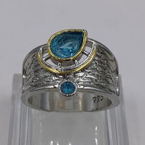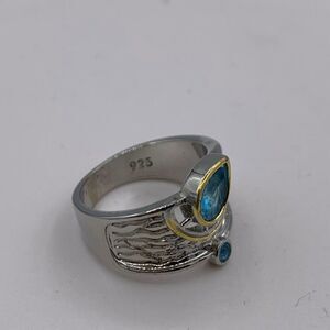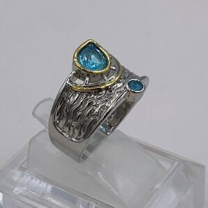 New item in. Impressive sized cigar band type ring in textured solid 925 silver. 2 aquamarine stones inset in gold over sterling trim. Pierced open work indicative off high end skilled craftsmanship. Big, expensive looking, but not! Sizes 6, 8, 9 available. Plse indicate your size when ordering. Perfect for gift giving. Goes casual with favourite jeans but dramatic enough to go full on glam for evening. Add some coordinating pieces from Our closet to complete a purpose built look, bundle and save. (Some suggestions shown, all listed and priced separately). Check in often because there is always something Fresh at Lemon Squeezy Shop🍋