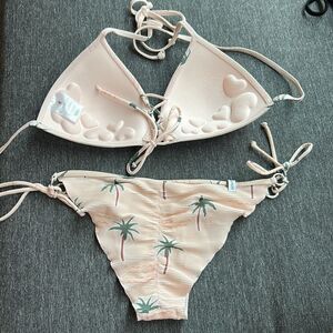 Stylish bikini with palm tree design. Triangle top with adjustable ties. Comfortable fit.