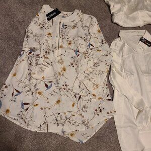 NWT 3 blouses- The 2 white satin collared ones are the same shirt, and button up, and have buttons at end of sleeve.