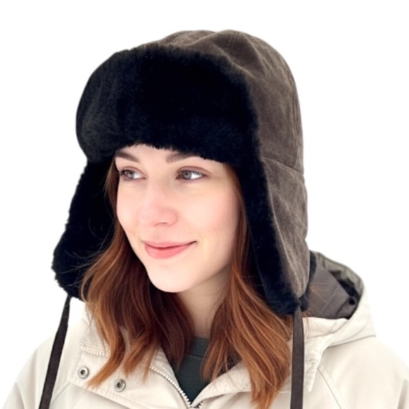 NWT 90s Y2K Pleau Quebec brown suede faux fur lined warm winter trapper hat M
